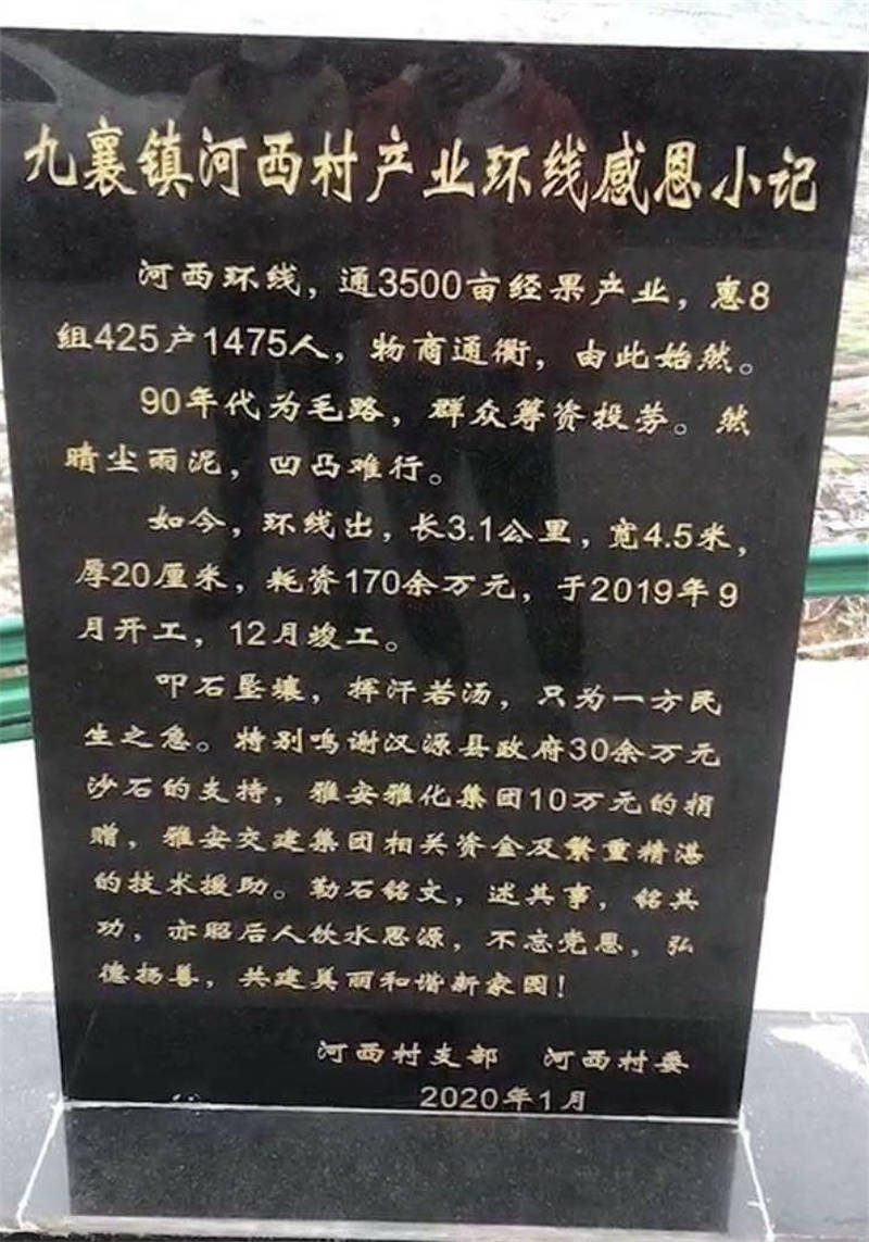 近期,漢源縣九襄鎮(zhèn)河西村勒石銘文,撰寫“九襄鎮(zhèn)河西村產(chǎn)業(yè)環(huán)線感恩小記”,以紀念該村水泥環(huán)線公路竣工通車。