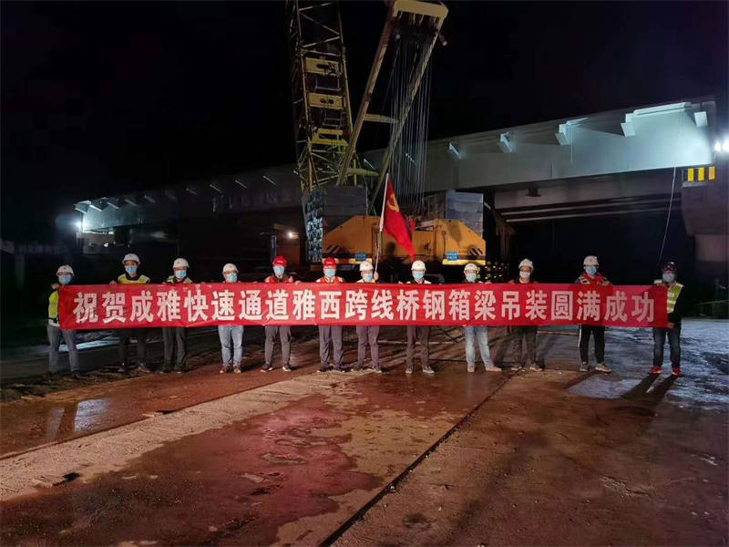 雅西跨線橋是成雅快速通道(雅安段)新建工程重要組成部分,該橋?yàn)閱慰绾喼т撓淞簶,全橋設(shè)計(jì)鋼箱梁4片,單片重量約140噸、長55余米,體積大、自身重、運(yùn)輸困難,且投入的大型機(jī)械設(shè)備較多,施工組織難度大。為順利完成架設(shè)任務(wù),市交通局會(huì)同市交建集團(tuán)、交建項(xiàng)目管理公司、市公安局交警支隊(duì)和各參建單位多次組織召開專題會(huì)議,提前謀劃、細(xì)致安排、優(yōu)化組織,制定了施工專項(xiàng)方案和應(yīng)急措施,使整個(gè)施工過程按照標(biāo)準(zhǔn)化、程序化、規(guī)范化進(jìn)行施工,為鋼箱梁的成功吊裝奠定了堅(jiān)實(shí)的基礎(chǔ)。