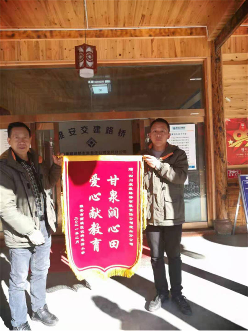 2月19日,雅安市雨城區(qū)第四小學(xué)漢碑校區(qū)將一面繡有“甘泉潤心田、愛心獻(xiàn)教育 ”的錦旗送到交建路橋公司寶興項(xiàng)目部,感謝路橋公司向漢碑校區(qū)捐贈(zèng)5萬元基金用以建設(shè)該校勞動(dòng)教育烹飪基地。