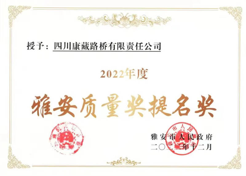 近日,雅安市人民政府根據(jù)《雅安質(zhì)量獎(jiǎng)評(píng)審管理辦法》相關(guān)規(guī)定,公布了“2022 年度雅安質(zhì)量獎(jiǎng)”,交建路橋榮獲“2022 年度雅安質(zhì)量獎(jiǎng)提名獎(jiǎng)”稱號(hào)。