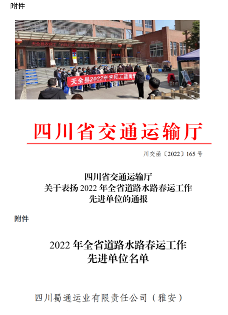 蜀通公司認真落實各級政府和行業(yè)主管部門有關春運工作的安排部署,堅持以“冬安行動”為抓手,全力以赴做好春運期間運輸安全和疫情防控,確保全市交通運輸暢通、民生出行順利。2022年春運期間,共投入班線車輛16546臺,發(fā)班21269班次,其中加班422班次,安全運送旅客26余萬人次,圓滿完成2022年春運工作,被四川省交通運輸廳評為“2022年全省道路水路春運工作先進單位”。