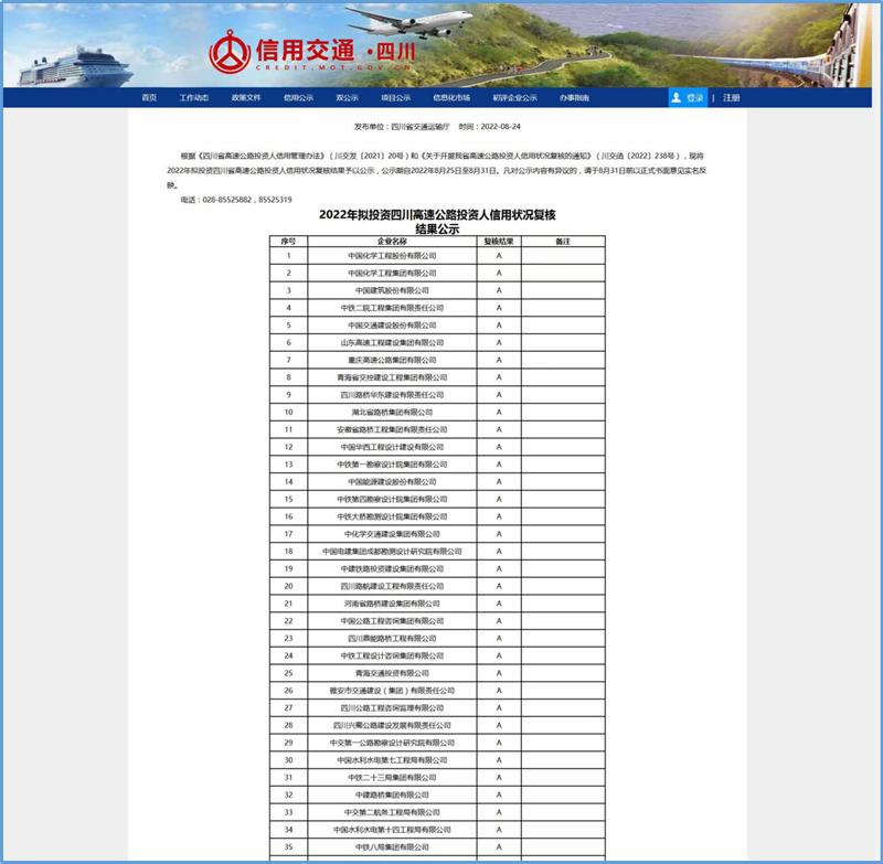 近日,四川省交通運輸廳“信用交通(四川)”公示2022年擬投資四川省高速公路投資人信用狀況復(fù)核結(jié)果和2022年第3批擬投資四川省高速公路投資人初次信用評價結(jié)果,雅安市交通建設(shè)(集團(tuán))有限責(zé)任公司及下屬全資子公司四川康藏路橋有限責(zé)任公司獲得“A”級信用評價。