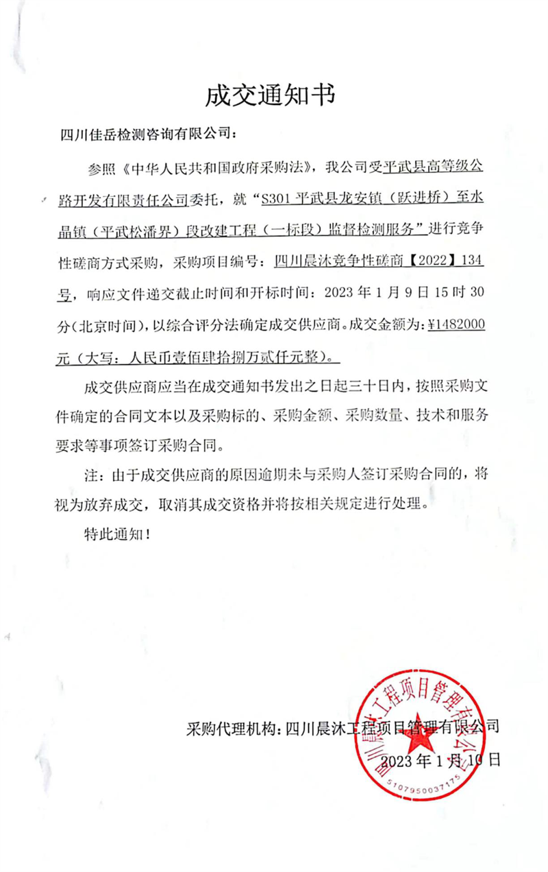 中標(biāo)項(xiàng)目為S301平武縣龍安鎮(zhèn)(躍進(jìn)橋)至水晶鎮(zhèn)(平武松潘界)段改建工程(一標(biāo)段)監(jiān)督檢測(cè)服務(wù)項(xiàng)目,成交金額148萬余元。此次成功中標(biāo)展示了公司的檢測(cè)能力和市場(chǎng)競爭力,為公司“走出去”積極承攬市外、省外業(yè)務(wù)增添信心。