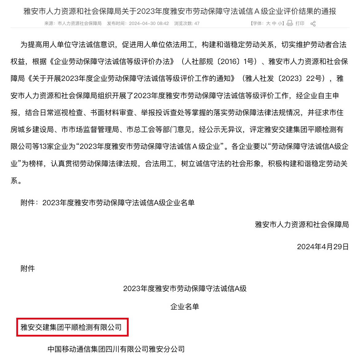 近日,雅安市人社局發(fā)布通報,雅安交建集團(tuán)平順公司被評定為“2023年度雅安市勞動保障守法誠信A級企業(yè)”。此次評選由人社局結(jié)合日常巡視檢查、書面材料審查、舉報投訴查處以及專項檢查等活動掌握的落實勞動保障法律法規(guī)情況,并征求市場監(jiān)管局等部門和單位意見后,綜合評定而出。