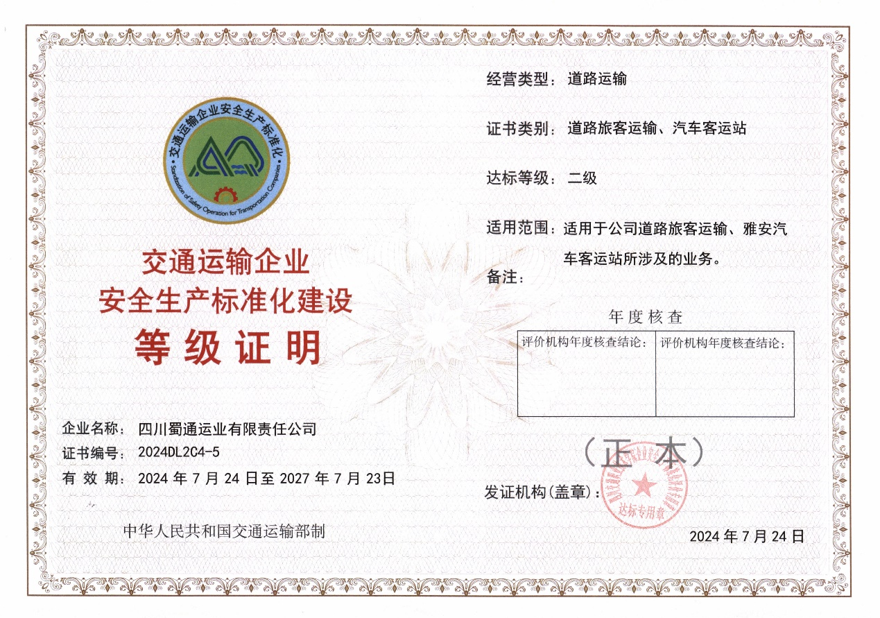 近日,經(jīng)四川省交通運(yùn)輸企業(yè)安全生產(chǎn)標(biāo)準(zhǔn)化評價機(jī)構(gòu)綜合評定,雅安交建集團(tuán)蜀通公司順利通過安全標(biāo)準(zhǔn)化二級企業(yè)驗收并獲得等級證書,標(biāo)志著公司安全管理工作更趨于標(biāo)準(zhǔn)化,安全管理水平邁上了新臺階。