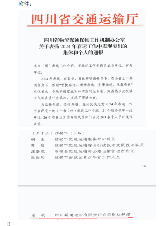 近日,交建集團(tuán)蜀通公司副總經(jīng)理謝斌獲四川省交通運(yùn)輸廳2024年春運(yùn)工作表現(xiàn)突出通報表揚(yáng)。