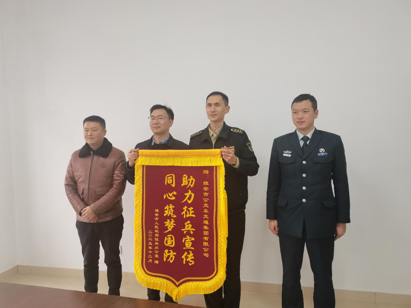 近日,雅安市人民政府征兵辦公室副主任、雅安軍分區(qū)動(dòng)員處上校處長(zhǎng)賈子龍一行專(zhuān)程赴公交集團(tuán)贈(zèng)送錦旗,感謝公交集團(tuán)在2025年度征兵公益宣傳工作中作出的貢獻(xiàn),公司董事長(zhǎng)李強(qiáng)軍接待并開(kāi)展座談。