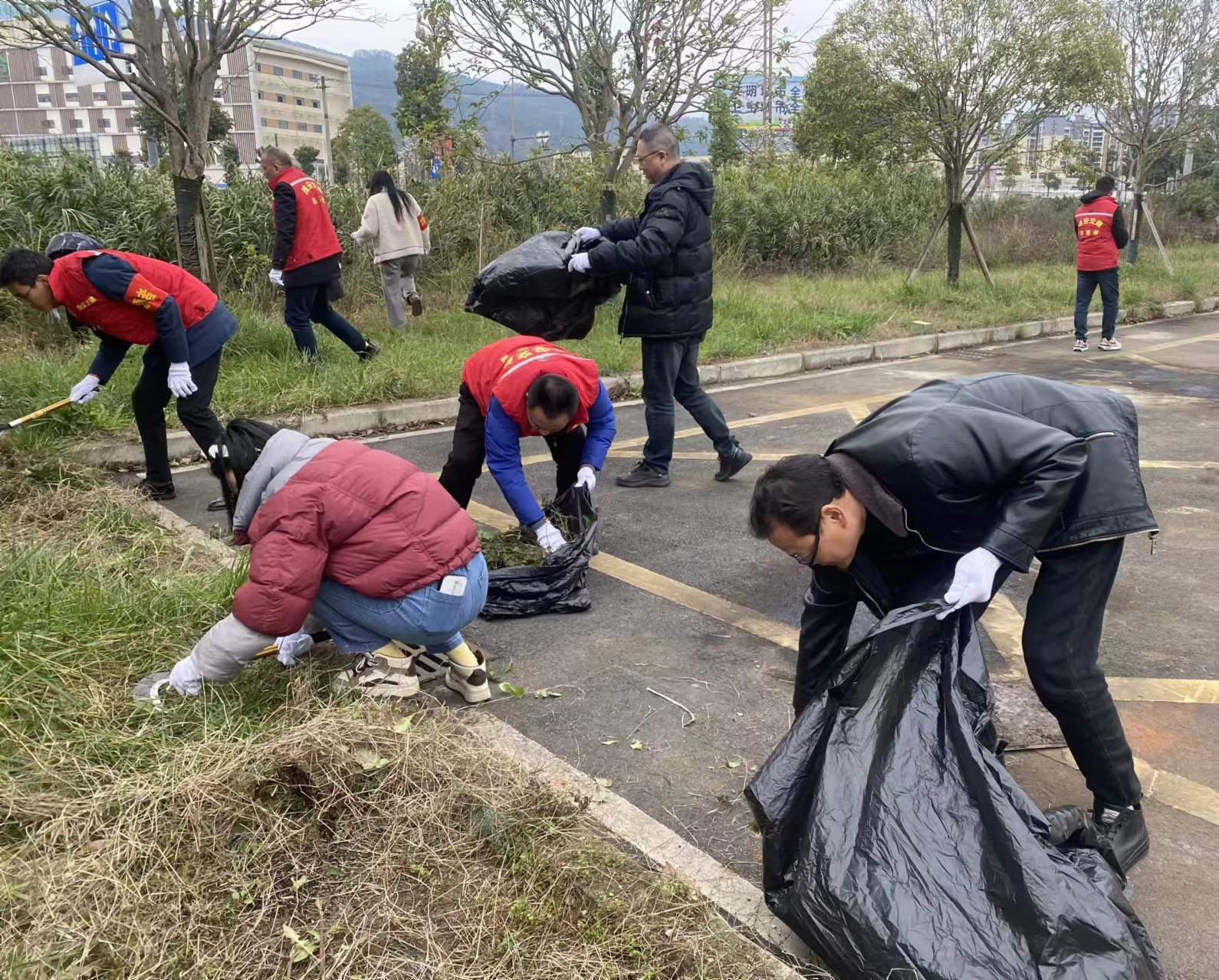 活動中,20余名黨員、入黨積極分子、團(tuán)員身著紅馬甲,肩戴紅袖章,手持鐮刀、垃圾袋等清潔工具,以小組的形式,明確分工,對大興街道興貿(mào)路A段綠化帶雜草進(jìn)行清理,并撿拾各種紙屑、廢棄塑料袋等垃圾。