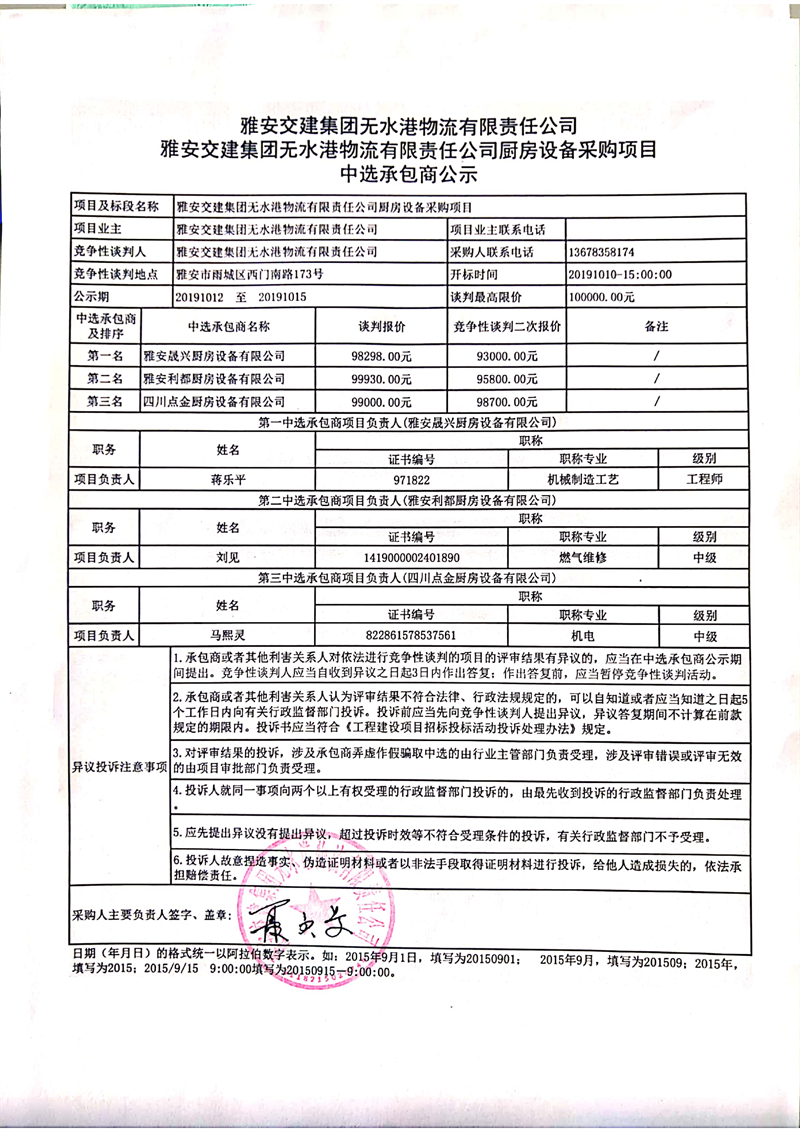 雅安交建集團(tuán)無水港物流有限責(zé)任公司廚房設(shè)備采購項(xiàng)目中選承包商公示