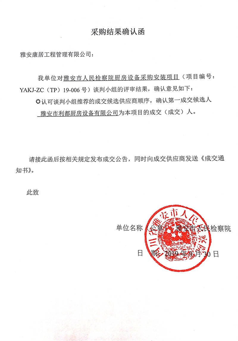 雅安市人民檢察院廚房設備采購安裝項目采購結(jié)果公示