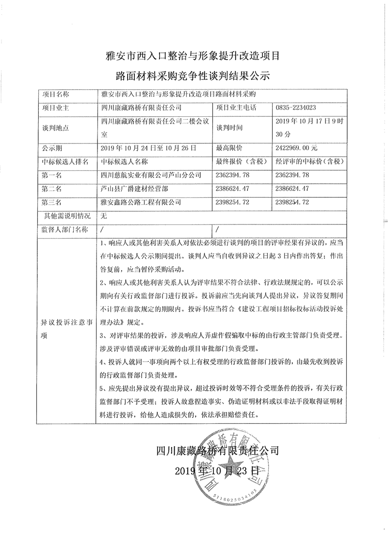 四川康藏路橋有限責任公司雅安市西入口整治與形象提升改造項目路面材料采購競爭性談判結(jié)果公示