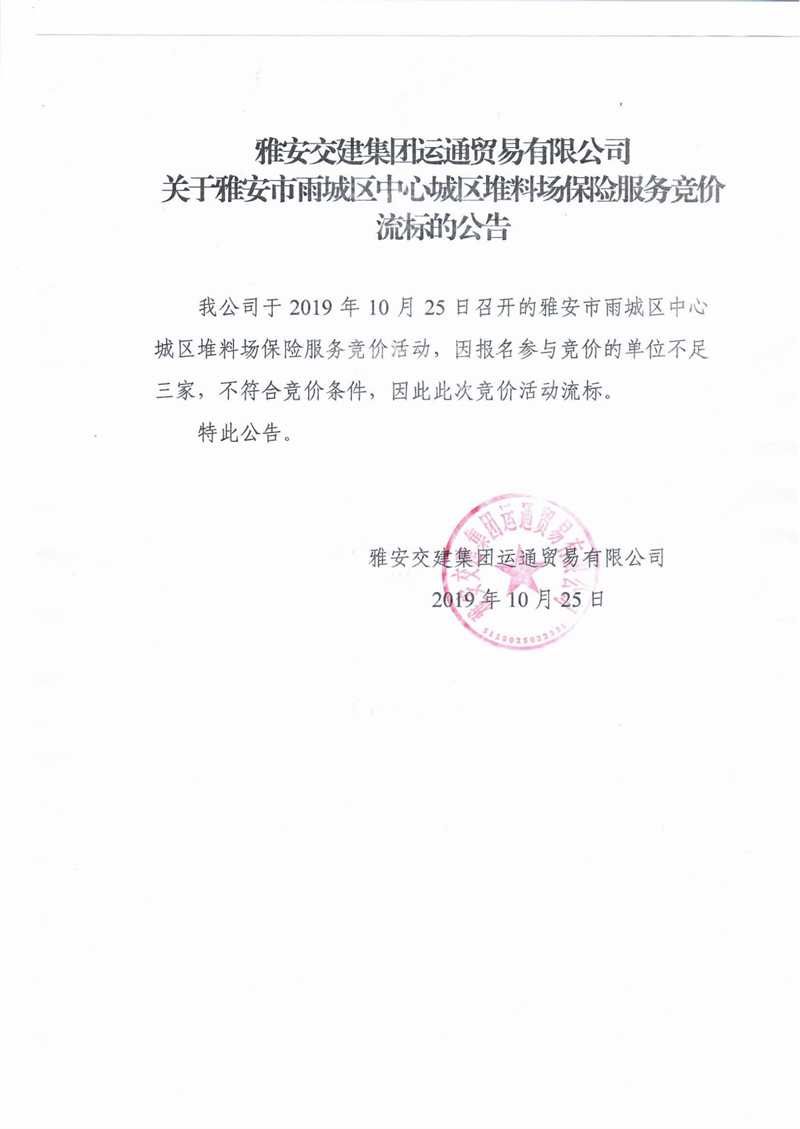 雅安交建集團(tuán)運(yùn)通貿(mào)易有限公司關(guān)于雅安市雨城區(qū)中心城區(qū)堆料場(chǎng)保險(xiǎn)服務(wù)競(jìng)價(jià)流標(biāo)的公告