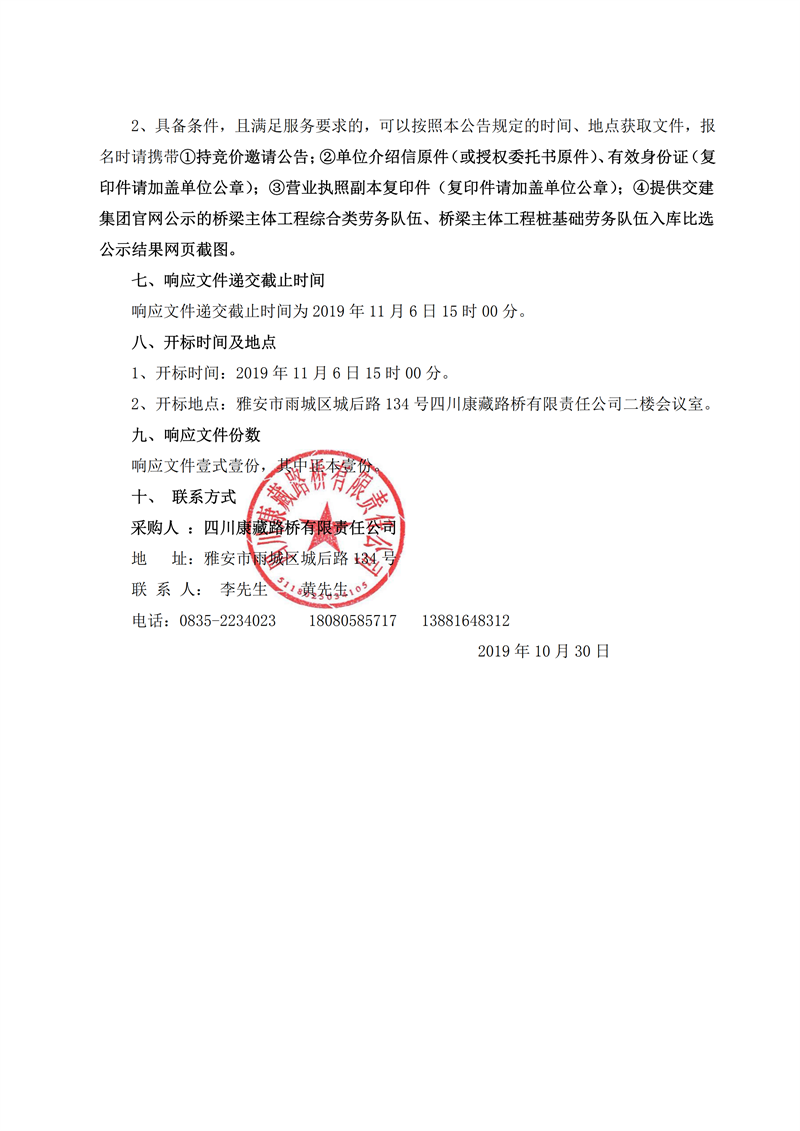 四川康藏路橋有限責(zé)任公司省道104線草壩至姚橋段改建工程項(xiàng)目橋梁樁基礎(chǔ)施工勞務(wù)競(jìng)價(jià)公告