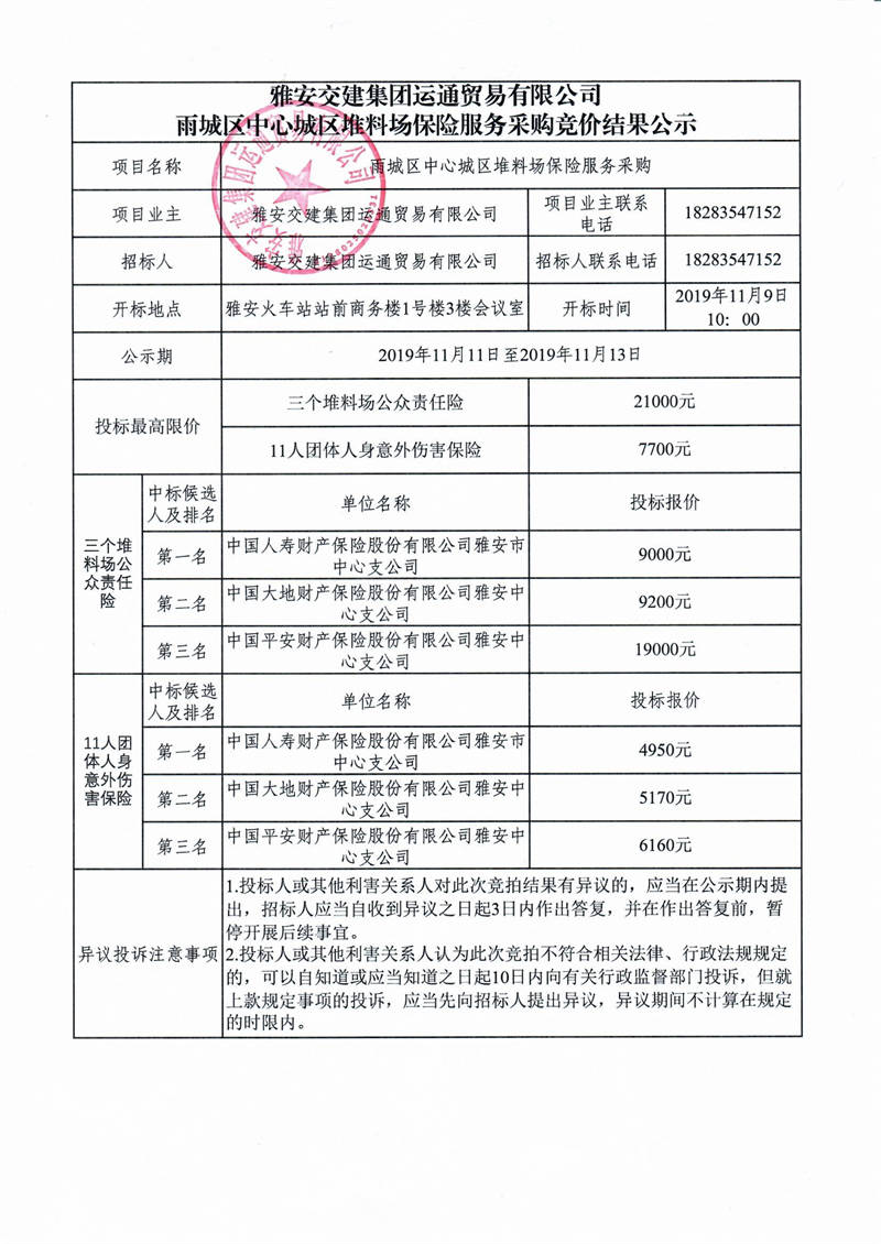 雅安交建集團(tuán)運(yùn)通貿(mào)易有限公司雨城區(qū)中心城區(qū)堆料場(chǎng)保險(xiǎn)服務(wù)采購競(jìng)價(jià)結(jié)果公示