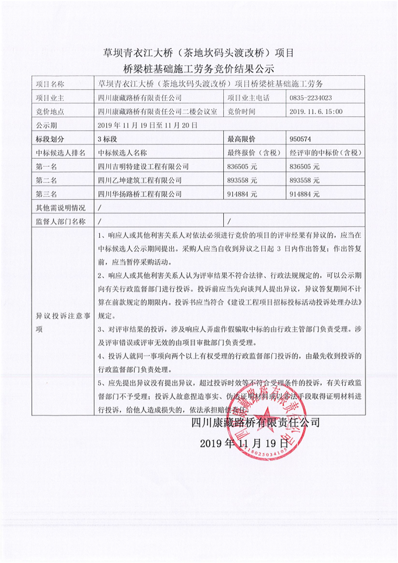 四川康藏路橋有限責任公司草壩青衣江大橋(茶地坎碼頭渡改橋)項目橋梁樁基礎施工勞務競價(3標段)結(jié)果公示