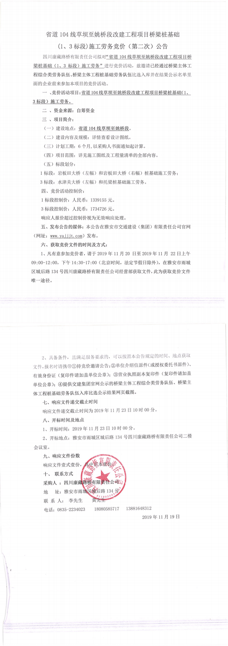 四川康藏路橋有限責(zé)任公司省道104線草壩至姚橋段改建工程項(xiàng)目橋梁樁基礎(chǔ)(1、3標(biāo)段)施工勞務(wù)競價(第二次)公告