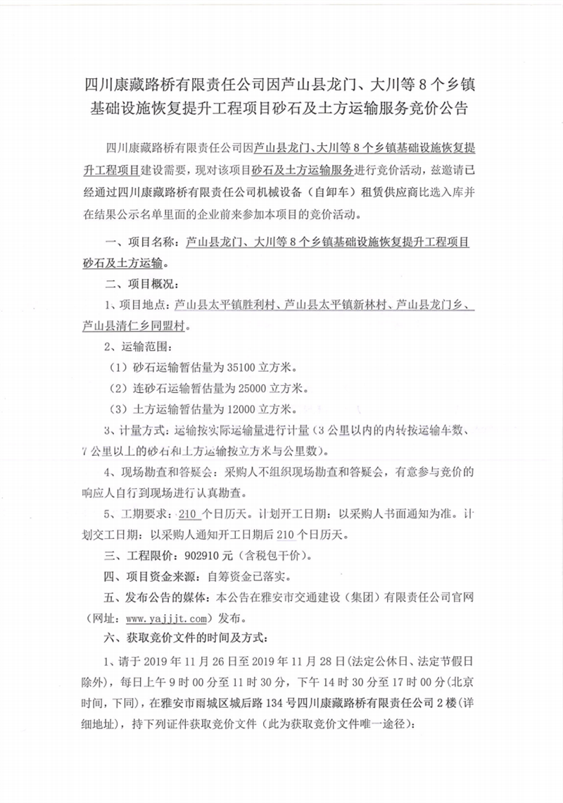 四川康藏路橋有限責(zé)任公司蘆山縣龍門、大川等8個鄉(xiāng)鎮(zhèn)基礎(chǔ)設(shè)施恢復(fù)提升工程項目砂石及土方運輸服務(wù)競價公告