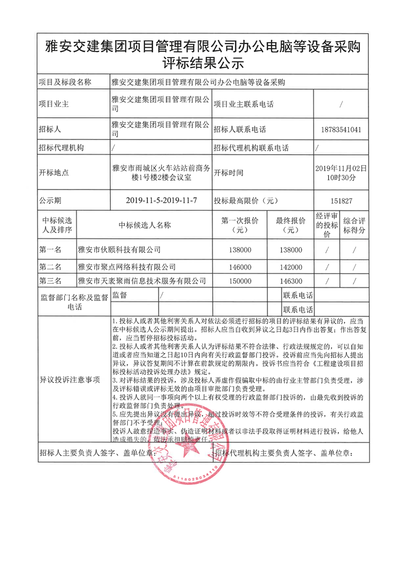 雅安交建集團項目管理有限公司辦公電腦等設備采購評標結果公示