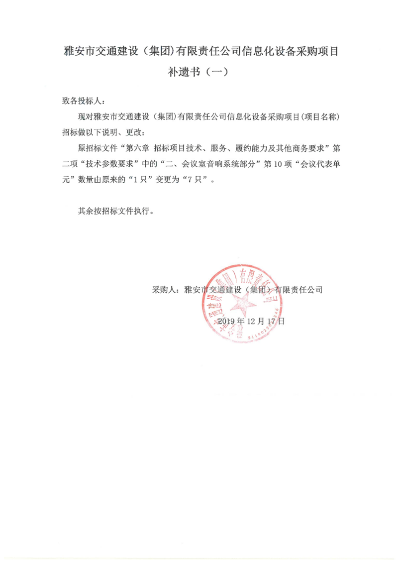 雅安市交通建設(shè)(集團(tuán))有限責(zé)任公司信息化設(shè)備采購項目補遺書(一)