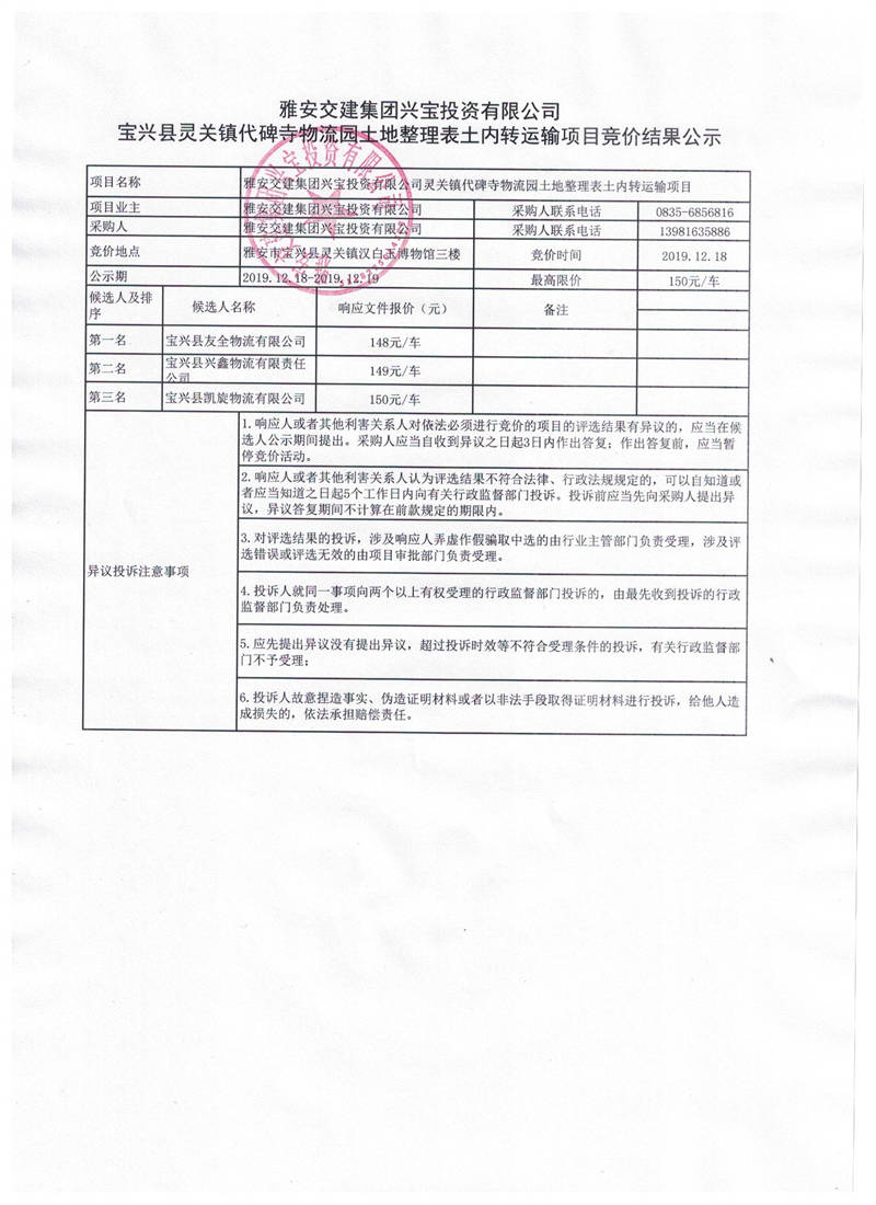 雅安交建集團興寶投資有限公司寶興縣靈關(guān)鎮(zhèn)代碑寺物流園土地整理表土內(nèi)轉(zhuǎn)運輸項目競價結(jié)果公示