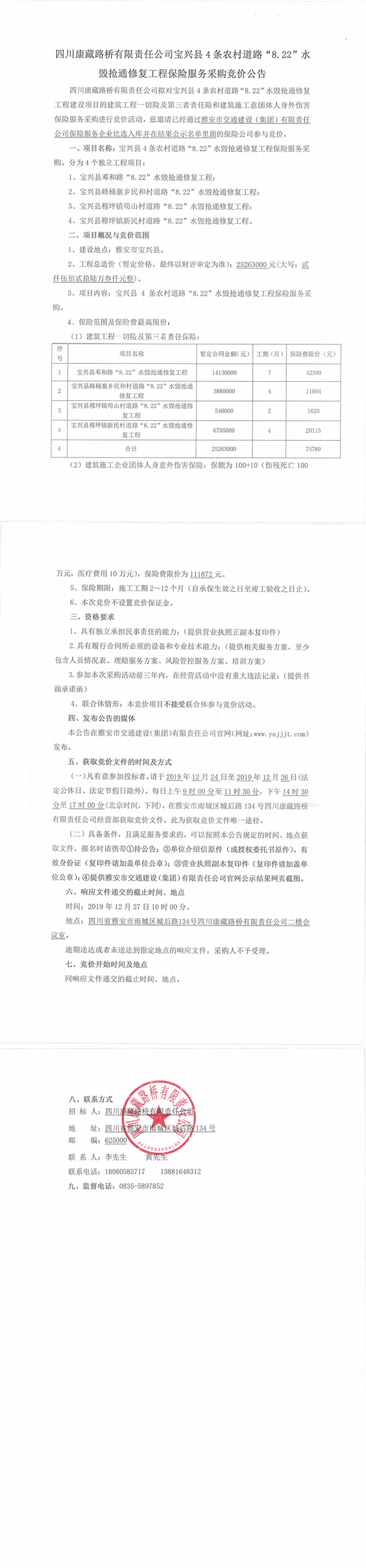 四川康藏路橋有限責任公司寶興縣4條農(nóng)村道路“8.22”水毀搶通修復工程保險服務采購競價公告