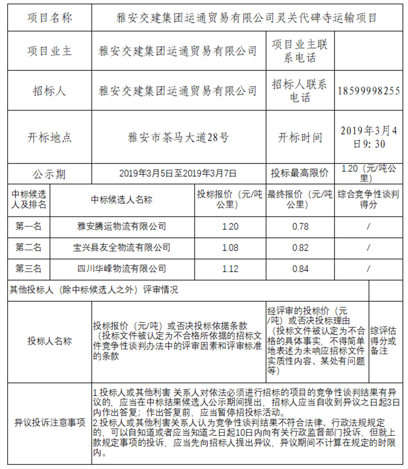 雅安交建集團(tuán)運(yùn)通貿(mào)易有限公司靈關(guān)代碑寺運(yùn)輸項(xiàng)目競(jìng)爭(zhēng)性談判結(jié)果公示
