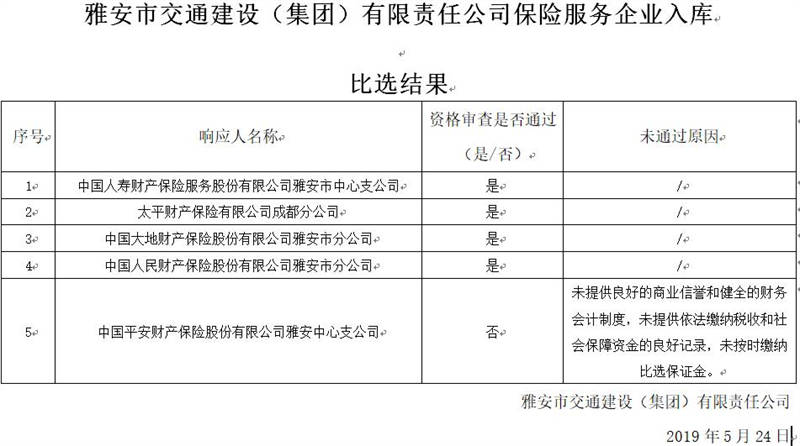 雅安市交通建設(shè)(集團(tuán))有限責(zé)任公司保險(xiǎn)服務(wù)企業(yè)入庫比選結(jié)果公示