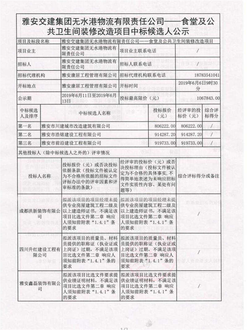 雅安交建集團(tuán)無水港物流有限公司食堂及公共衛(wèi)生間裝修改造項(xiàng)目中標(biāo)候選人公示