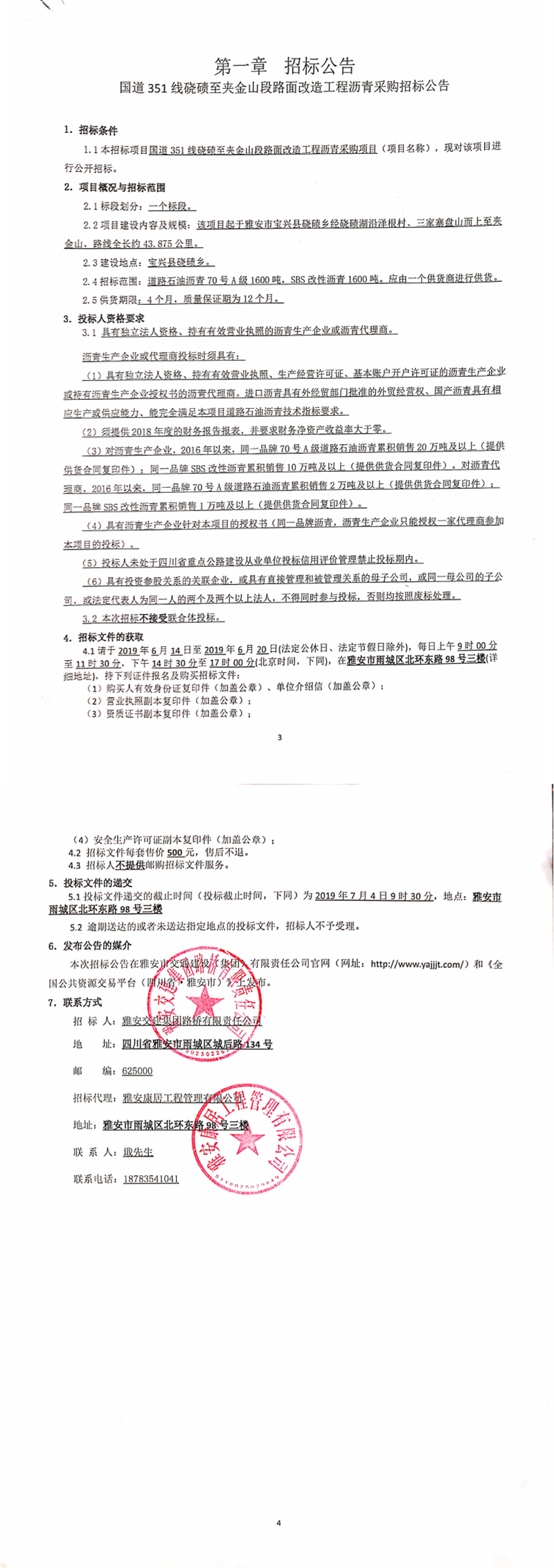 雅安交建集團(tuán)路橋有限責(zé)任公司國(guó)道351線磽磧至夾金山段路面改造工程瀝青采購(gòu)招標(biāo)公告