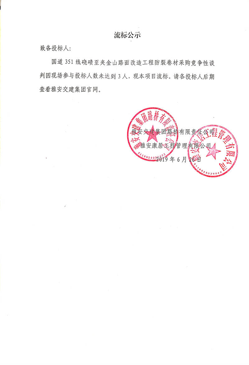 雅安交建集團(tuán)路橋有限責(zé)任公司國(guó)道351線(xiàn)磽磧至夾金山路面改造工程防裂卷材采購(gòu)競(jìng)爭(zhēng)性談判流標(biāo)公示