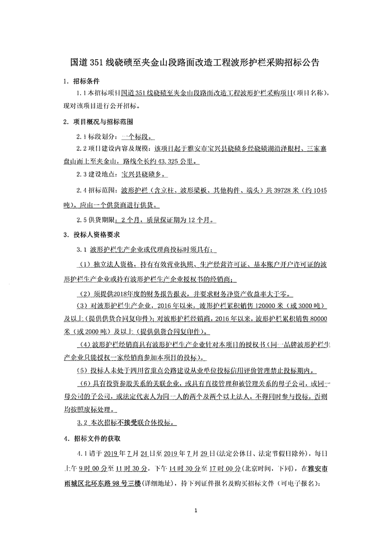 雅安交建集團(tuán)路橋有限責(zé)任公司國(guó)道351線磽磧至夾金山段路面改造工程波形護(hù)欄采購招標(biāo)公告