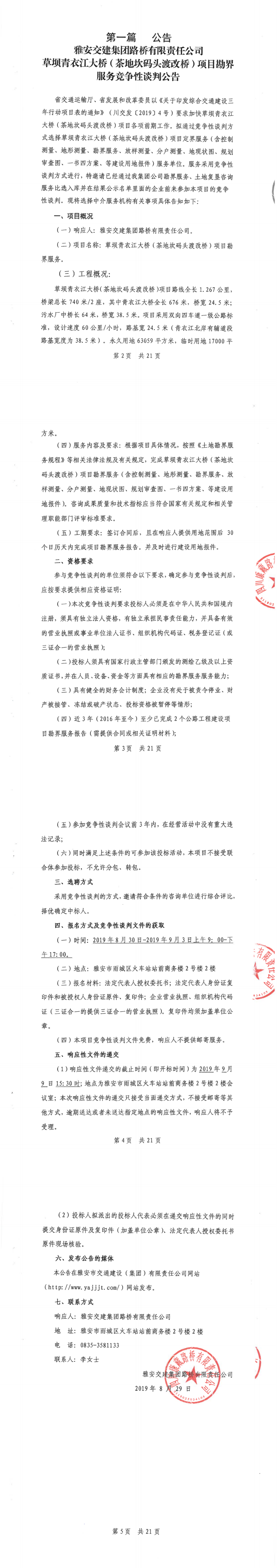 雅安交建集團(tuán)路橋有限責(zé)任公司草壩青衣江大橋(茶地坎碼頭渡改橋)項(xiàng)目勘界服務(wù)競爭性談判公告