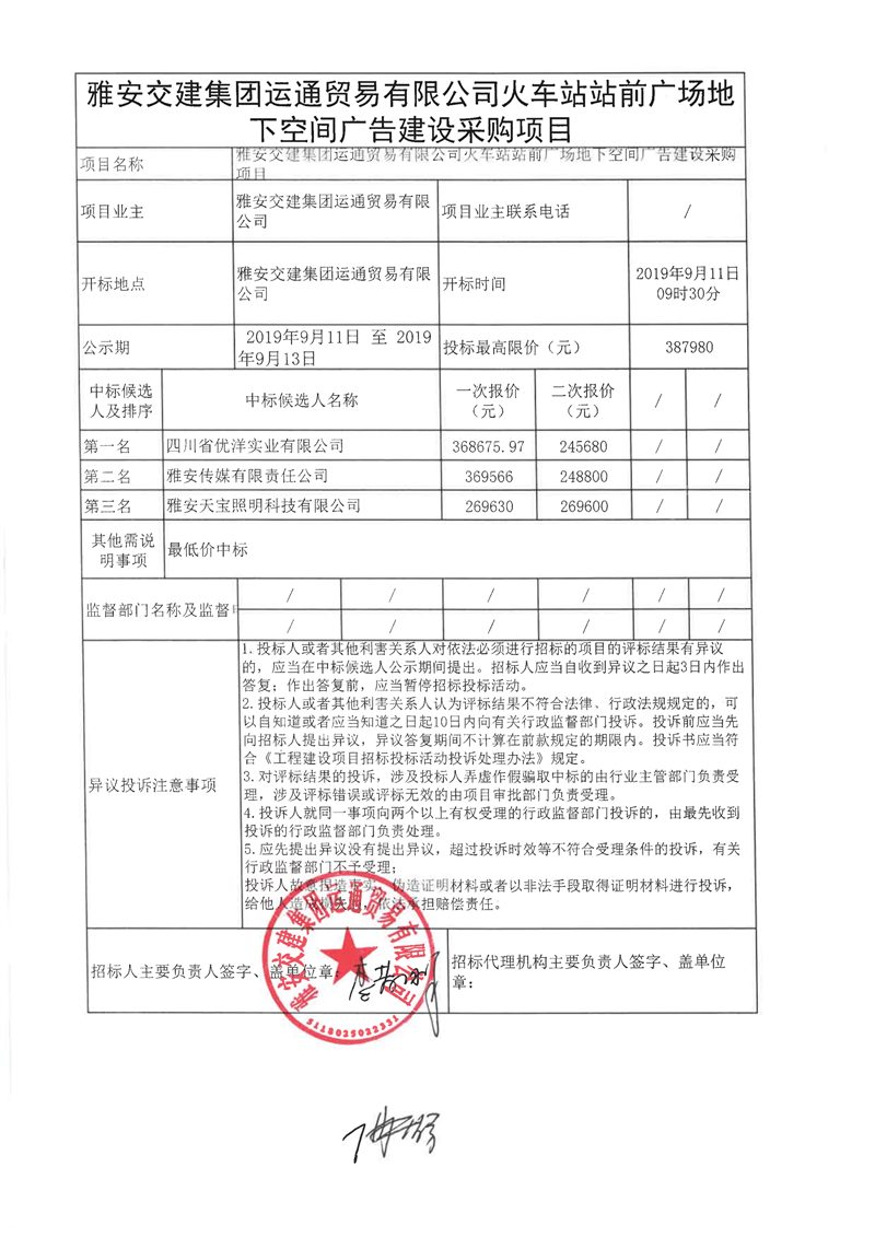 雅安交建集團運通貿易有限公司火車站站前廣場地下空間廣告建設采購項目結果公示