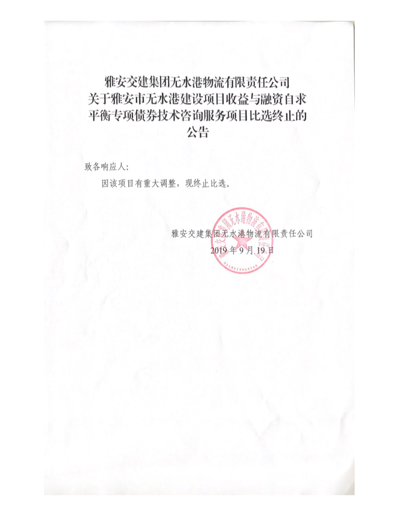雅安交建集團無水港物流有限責任公司關(guān)于雅安市無水港建設(shè)項目收益與融資自求平衡專項債券技術(shù)咨詢服務(wù)項目比選終止的公告