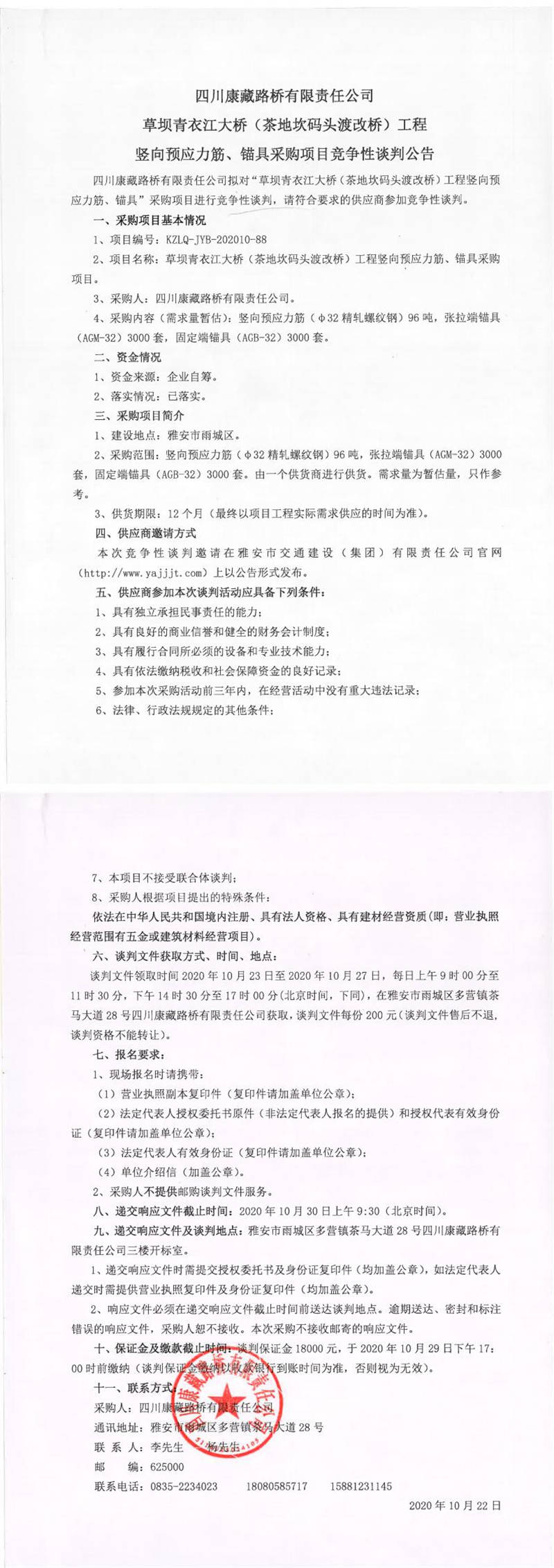 四川康藏路橋有限責(zé)任公司草壩青衣江大橋(茶地坎碼頭渡改橋)工程豎向預(yù)應(yīng)力筋、錨具采購項目競爭性談判公告