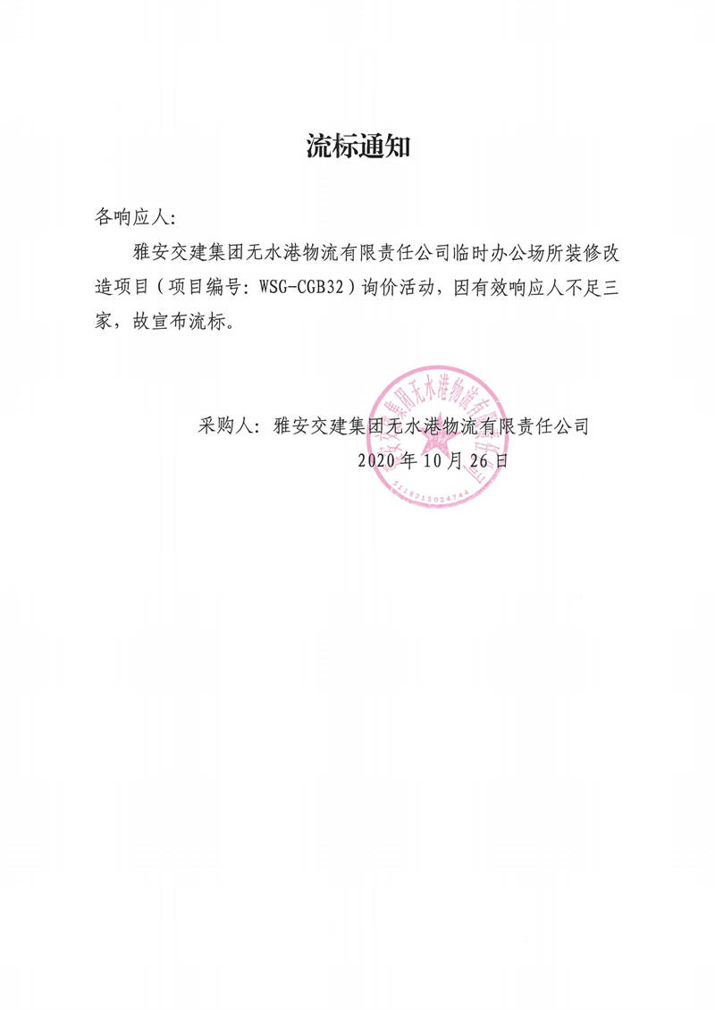 雅安交建集團(tuán)無水港物流有限責(zé)任公司臨時辦公場所裝修改造項(xiàng)目流標(biāo)通知