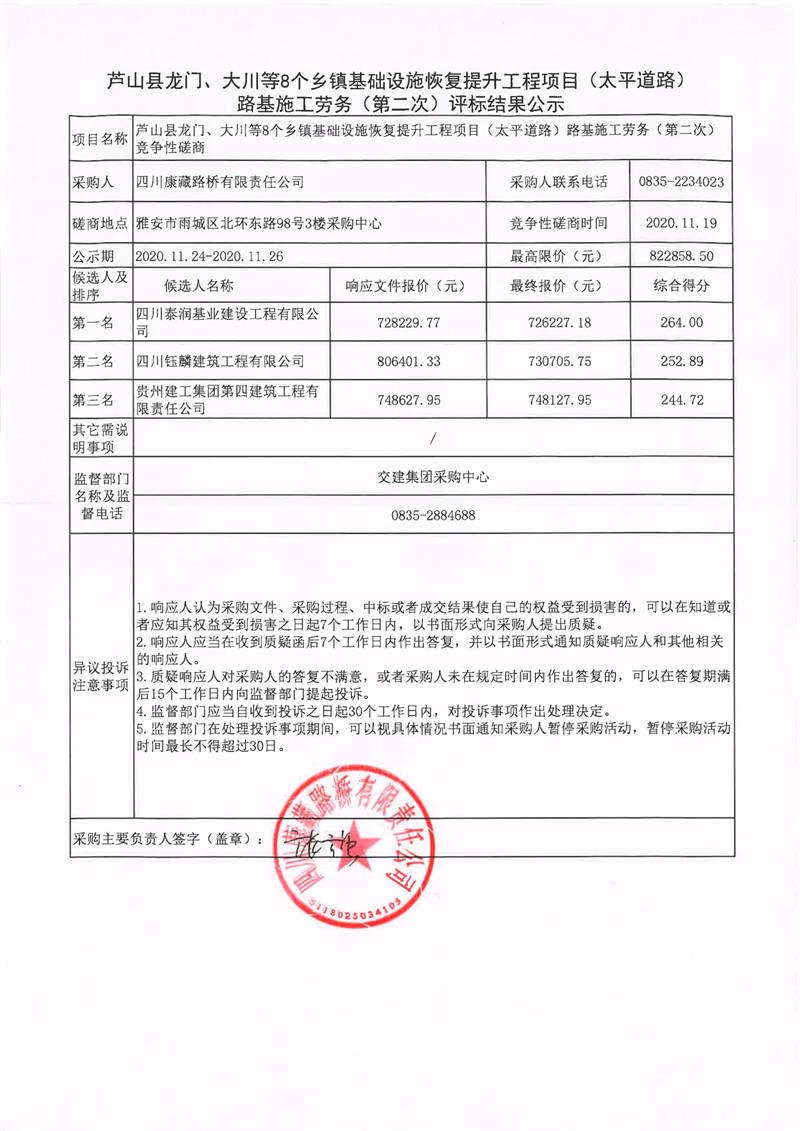 四川康藏路橋有限責(zé)任公司蘆山縣龍門、大川等8個(gè)鄉(xiāng)鎮(zhèn)基礎(chǔ)設(shè)施恢復(fù)提升工程項(xiàng)目(太平道路)路基施工勞務(wù)(第二次)評(píng)標(biāo)結(jié)果公示