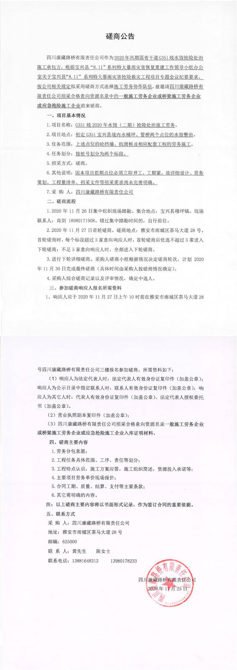 四川康藏路橋有限責任公司G351線2020年水毀(二期)搶險處治施工勞務磋商公告