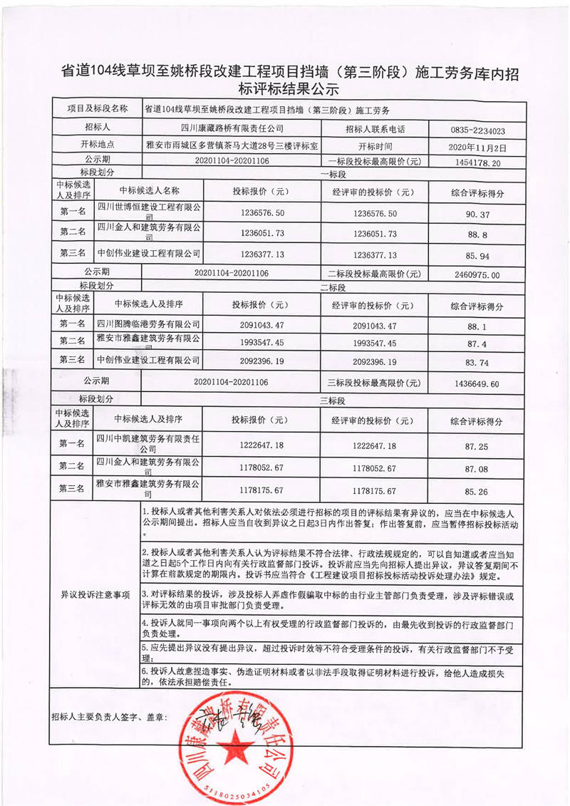 四川康藏路橋有限責(zé)任公司省道104線草壩至姚橋段改建工程項(xiàng)目擋墻(第三階段)施工勞務(wù)庫(kù)內(nèi)招標(biāo)評(píng)標(biāo)結(jié)果公示