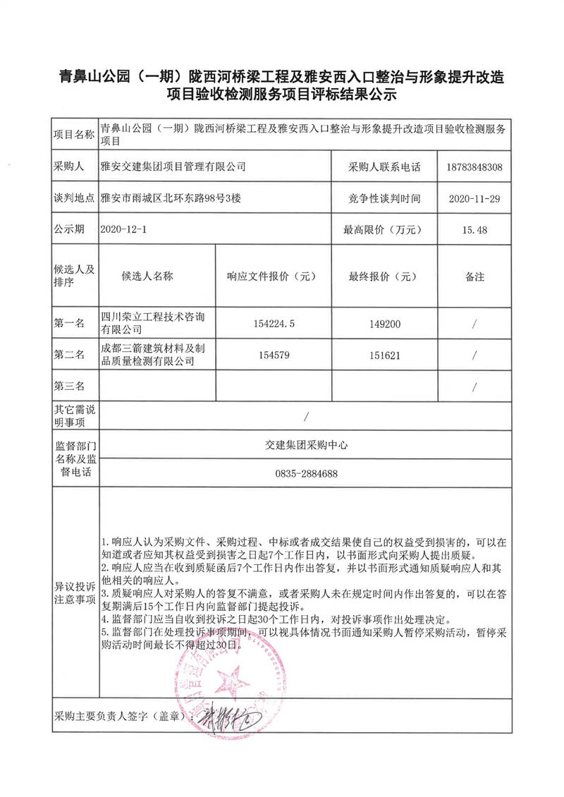 雅安交建集團項目管理有限公司青鼻山公園(一期)隴西河橋梁工程及雅安西入口整治與形象提升改造項目驗收檢測服務項目評標結果公示