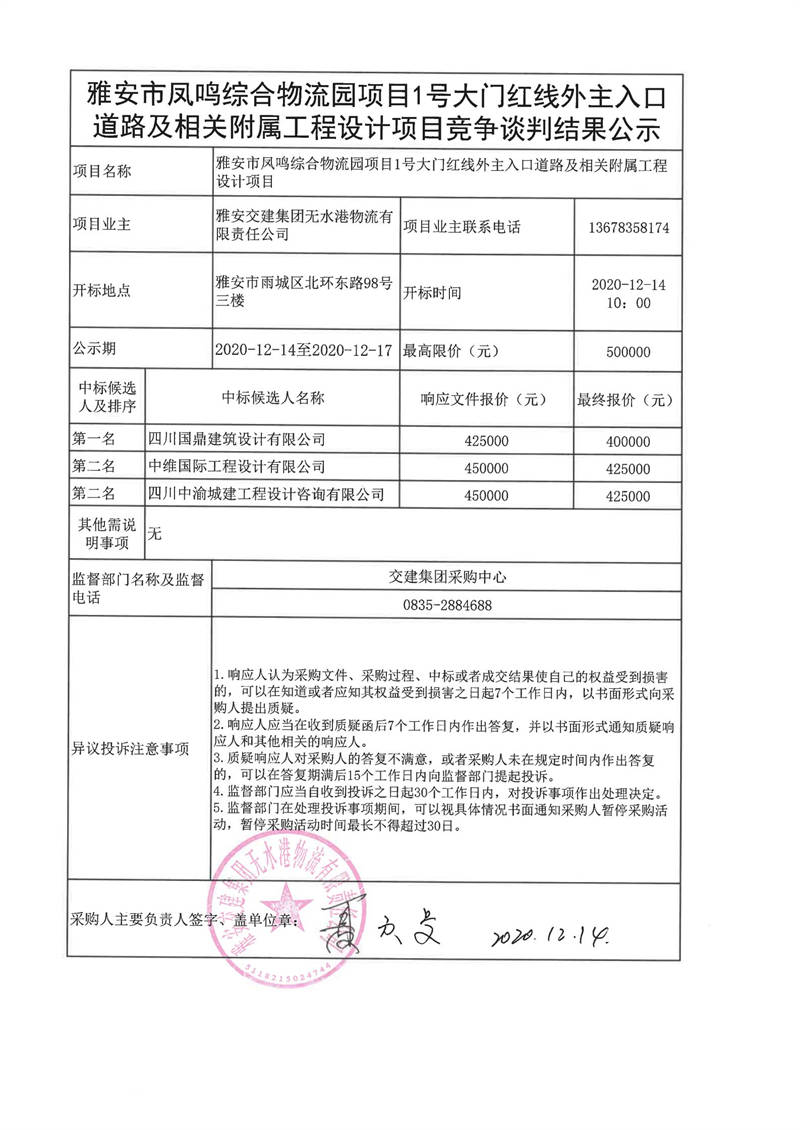 雅安交建集團無水港物流有限責任公司雅安市鳳鳴綜合物流園項目1號大門紅線外主入口道路及相關附屬工程設計項目談判結果公示