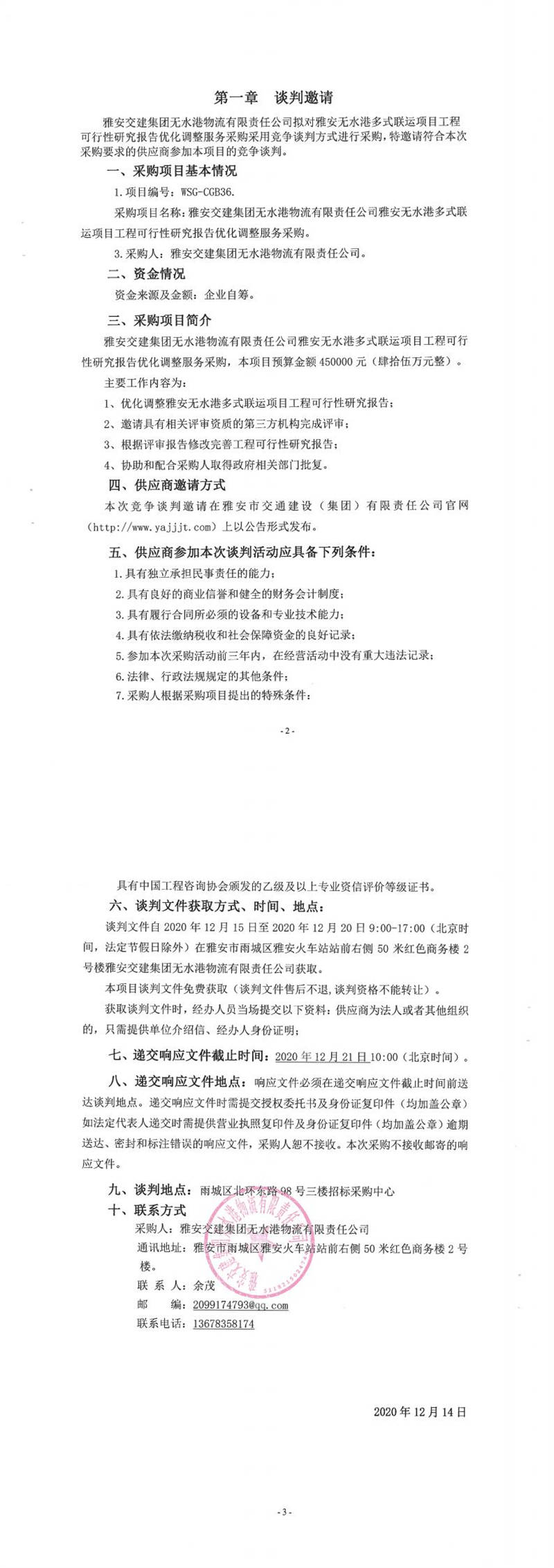 雅安交建集團(tuán)無水港物流有限責(zé)任公司雅安無水港多式聯(lián)運項目工程可行性研究報告優(yōu)化調(diào)整服務(wù)采購競爭談判公告