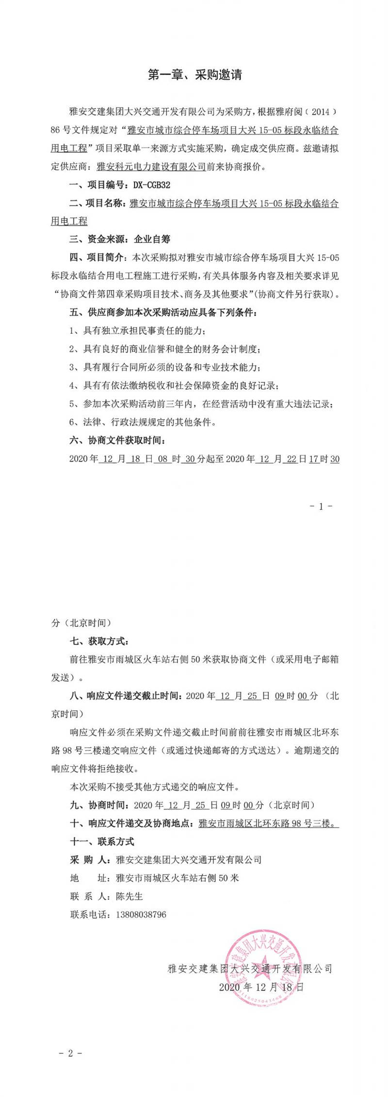 雅安交建集團(tuán)大興交通開(kāi)發(fā)有限公司雅安市城市綜合停車場(chǎng)項(xiàng)目大興15-05標(biāo)段永臨結(jié)合用電工程單一來(lái)源采購(gòu)邀請(qǐng)