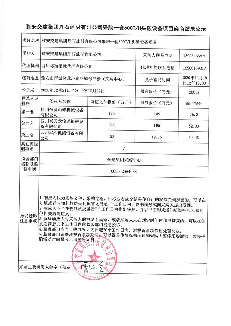 雅安交建集團(tuán)丹石建材有限公司采購一套600T/H頭破設(shè)備項目磋商結(jié)果公示
