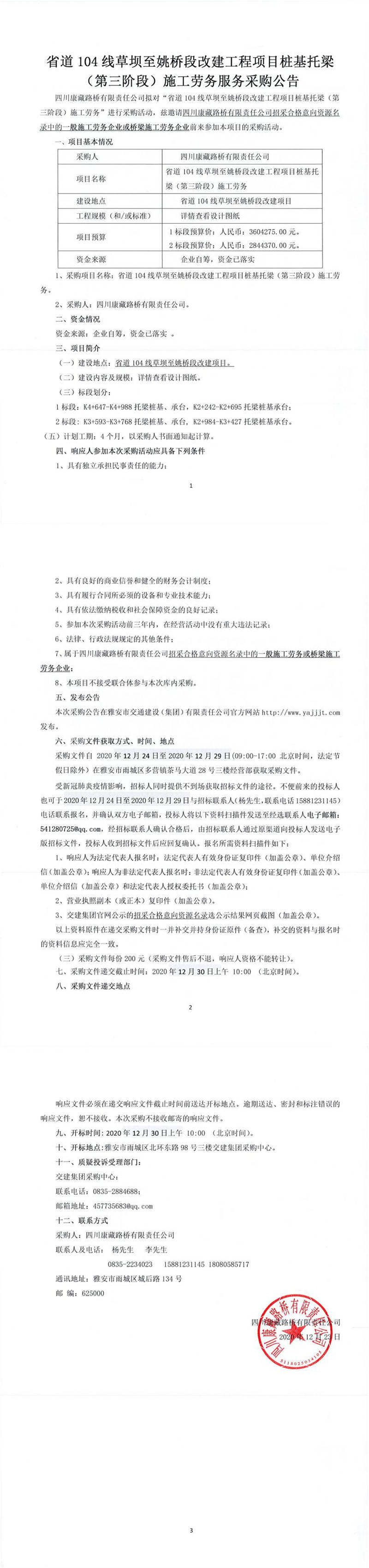 四川康藏路橋有限責(zé)任公司省道104線草壩至姚橋段改建工程項目樁基托梁(第三階段)施工勞務(wù)服務(wù)采購公告
