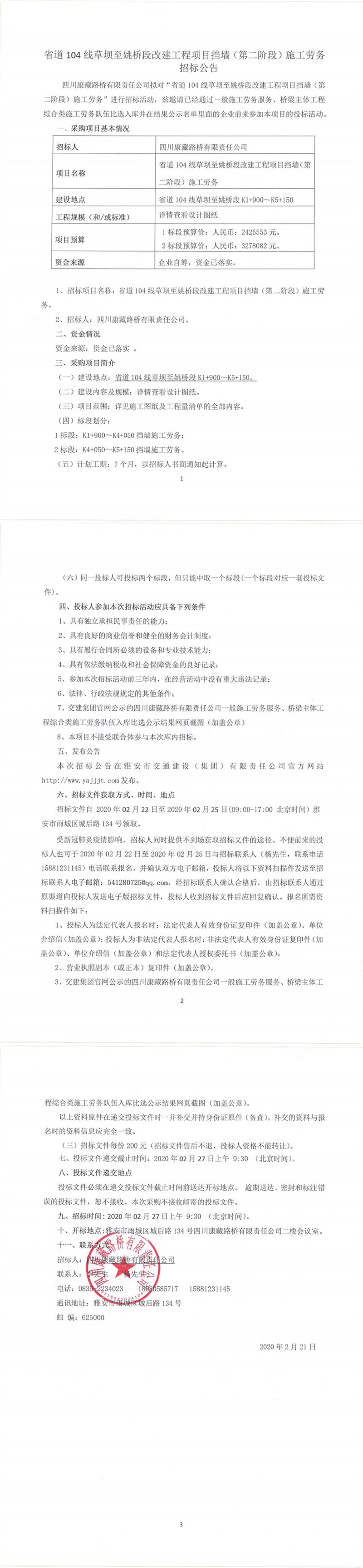 四川康藏路橋有限責(zé)任公司省道104線草壩至姚橋段改建工程項(xiàng)目擋墻(第二階段)施工勞務(wù)招標(biāo)公告