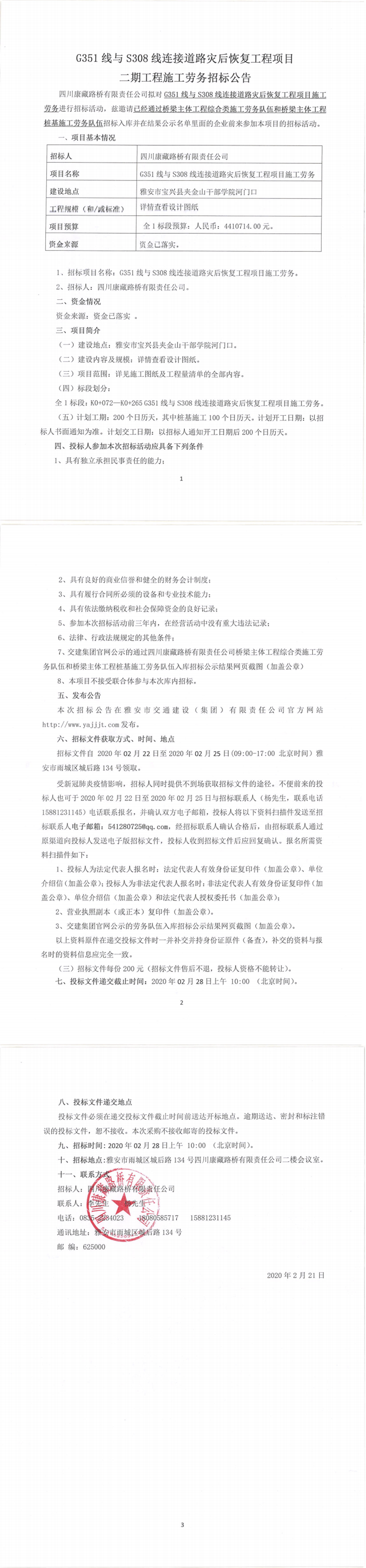 四川康藏路橋有限責任公司G351線與S308線連接道路災后恢復工程項目二期工程施工勞務招標公告