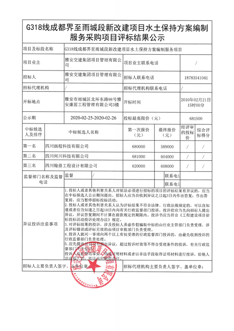 雅安交建集團(tuán)項(xiàng)目管理有限公司G318線成都界至雨城段新改建項(xiàng)目水土保持方案編制服務(wù)采購項(xiàng)目評(píng)標(biāo)結(jié)果公示