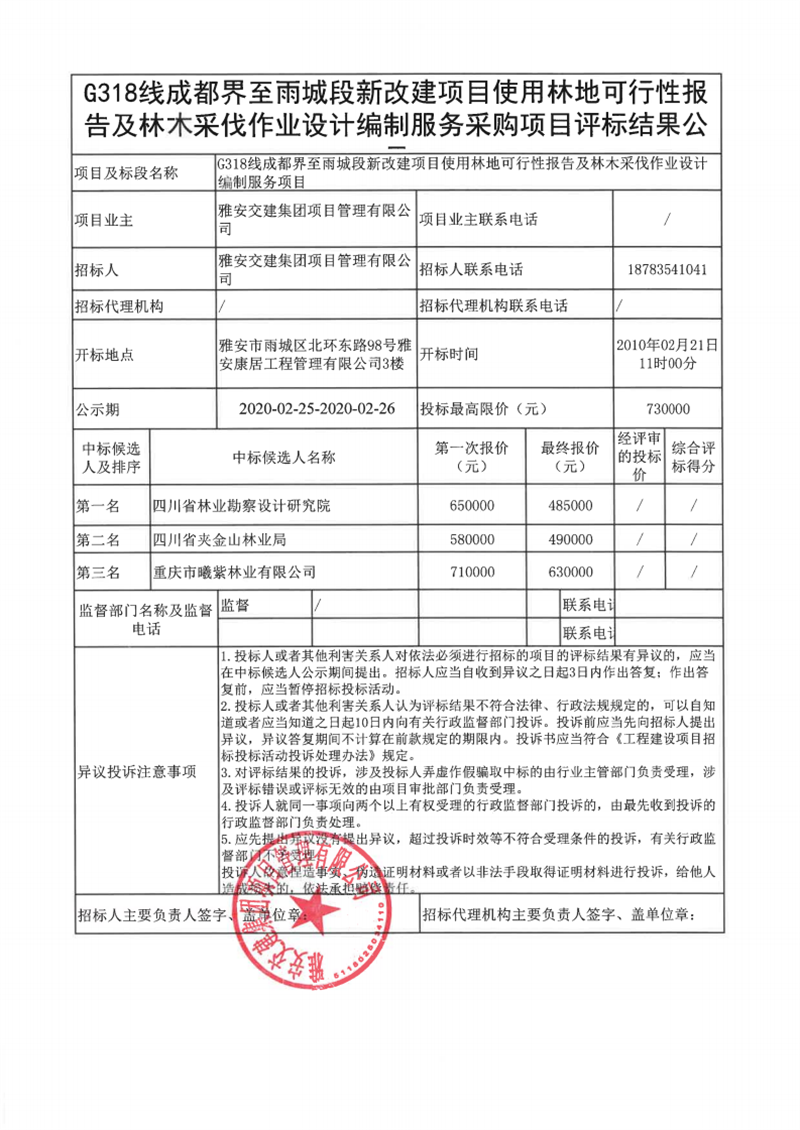雅安交建集團項目管理有限公司G318線成都界至雨城段新改建項目使用林地可行性報告及林木采伐作業(yè)設(shè)計編制服務(wù)采購項目評標(biāo)結(jié)果公示