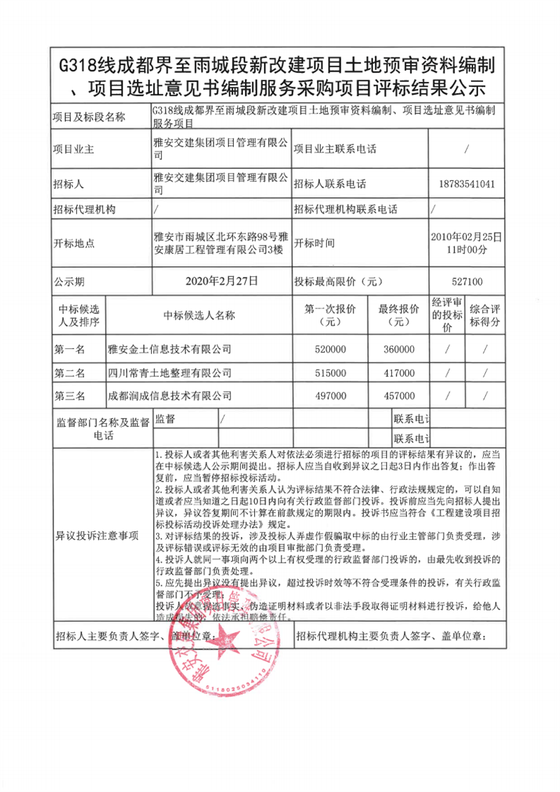 雅安交建集團項目管理有限公司G318線成都界至雨城段新改建項目土地預(yù)審資料編制、項目選址意見書編制服務(wù)采購項目評標結(jié)果公示